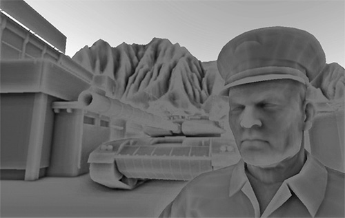 Конкретная реализация SSAO от Crytek обладала узнаваемым визуальным стилем. Поскольку специалисты Crytek использовали сферическое ядро выборки это сказывалось даже на плоских поверхностях типа стен, делая их затененными – ведь половина объема ядра выборки оказывалась погруженной под геометрию. Ниже – скриншот со сценой из Crysis, изображенной в градациях серого на основе значения коэффициента затенения. Здесь хорошо виден эффект «серости»: