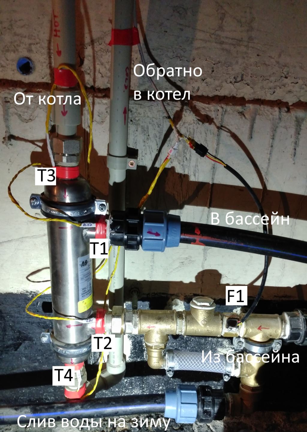 подогретым. Соотношение остывания воды от котла с нагревом воды бассейна зависит от многих факторов: мощности теплообменника и скорости циркуляции воды в первичном и вторичных контурах.