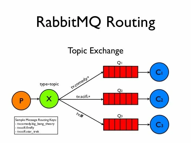На схеме P - producer, сервис отправляющий сообщения. X - маршрутизатор сообщений (он определяет в какую очередь попадёт сообщение), Q1, Q2, Q3 - очереди, C1, C2, C3 - потребители. Схема взаимосвязи микросервисов не обязательно такая, как указана на изображении. У одной очереди вполне может быть несколько продюсеров и несколько потребителей, всё зависит от самой архитектуры микросервисов.
