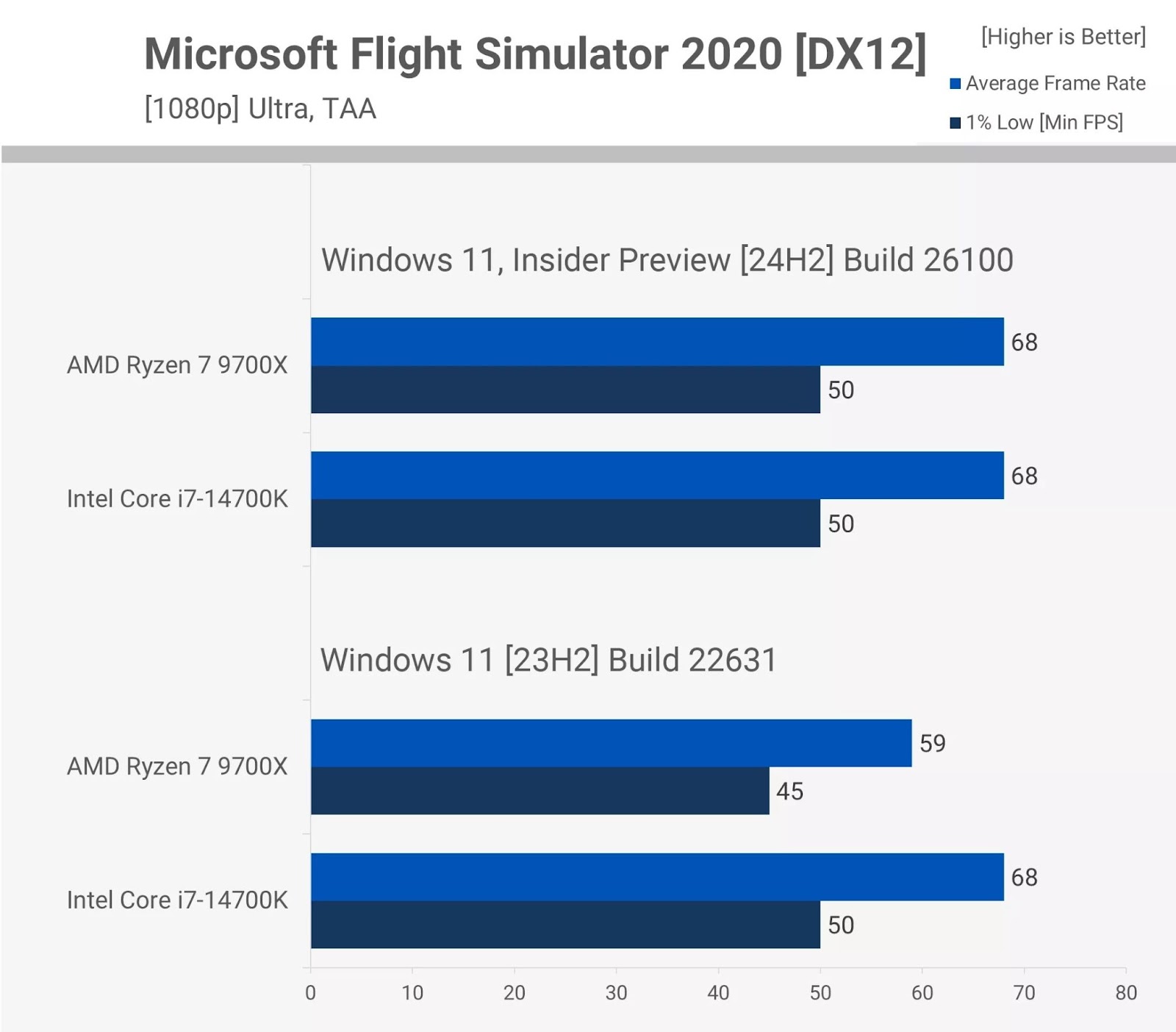 Аналогичная картина наблюдается в Microsoft Flight Simulator 2020, где разрыв в 13% превращается в паритет производительности, если машина использует свежий билд.