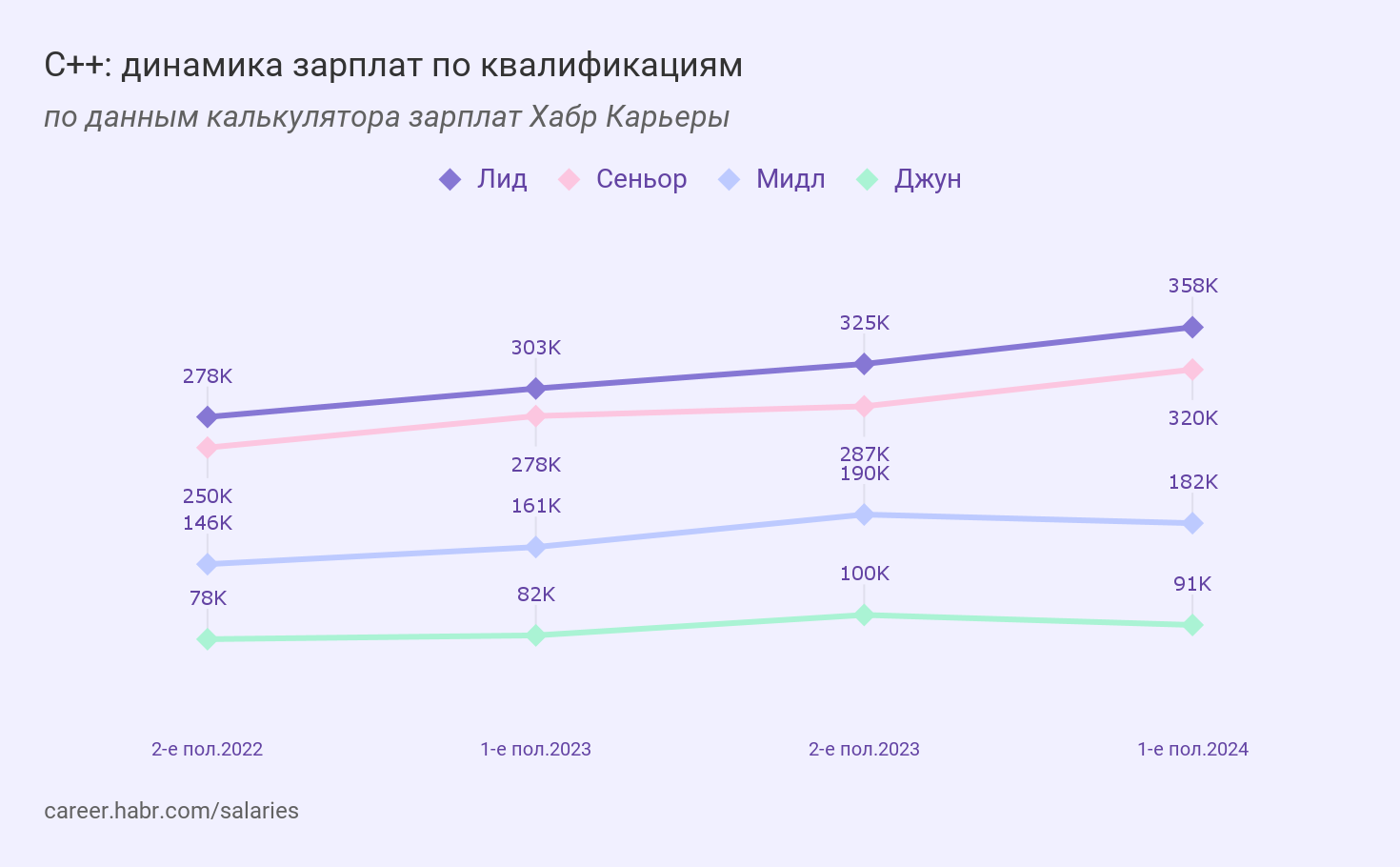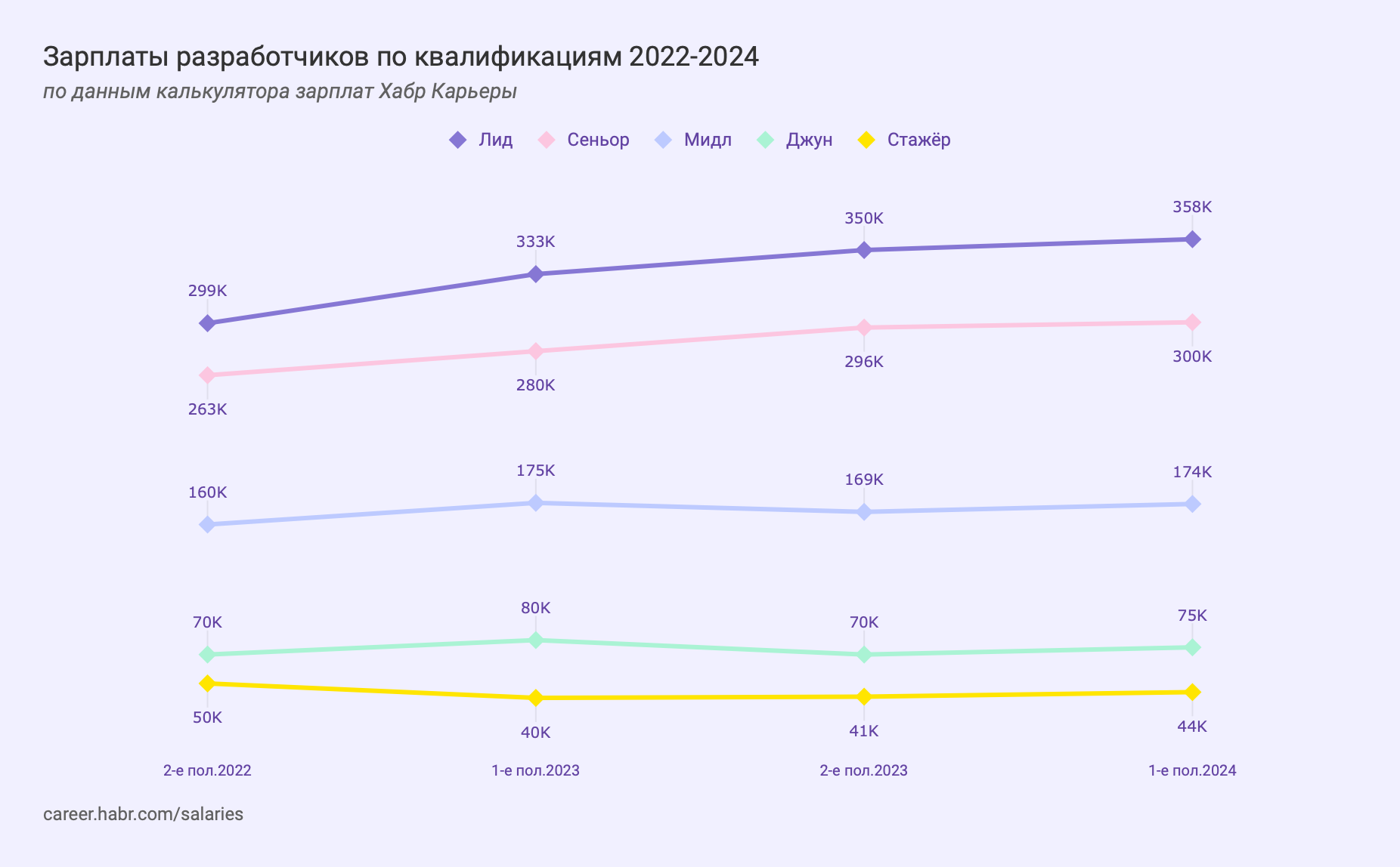 Джуны зарабатывали 87 150 ₽ (+16,2%), мидлы — 190 566 ₽ (+5,9%), сеньоры — 323 566 ₽ (+4,9%), лиды — 358 333 ₽ (-1,2%).