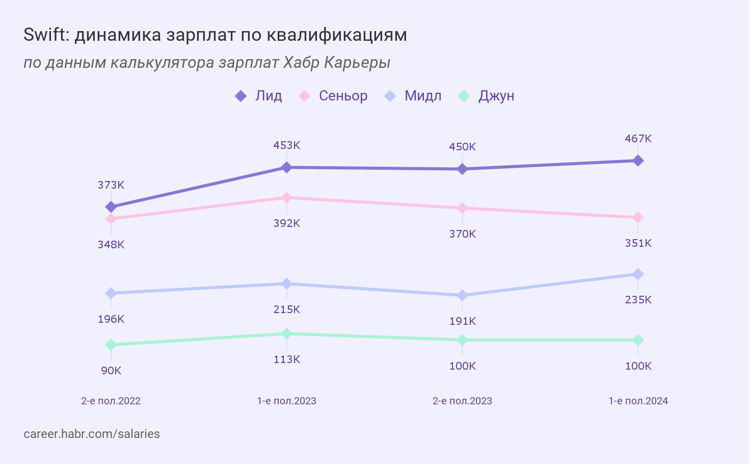 Среди лидов на первом месте по зарплате Swift-разработчики — 469 708 ₽. Самая низкая зарплата среди лидов у PHP-разработчиков — 320 000 ₽.
