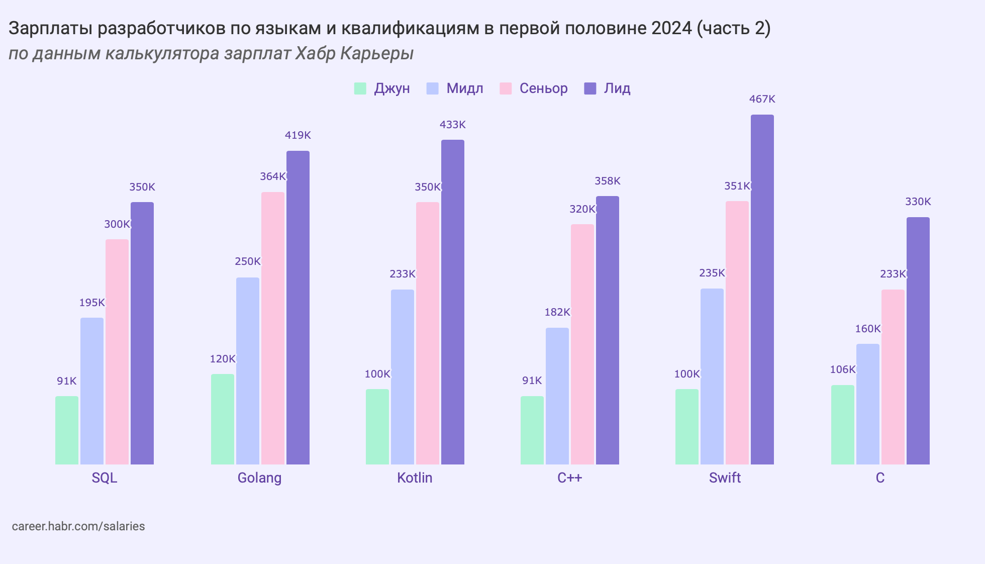 Самая большая разница между зарплатами джунов и лидов у Swift-разработчиков — 4.7 раз, а самая маленькая у C-разработчиков — 3.1 раза.