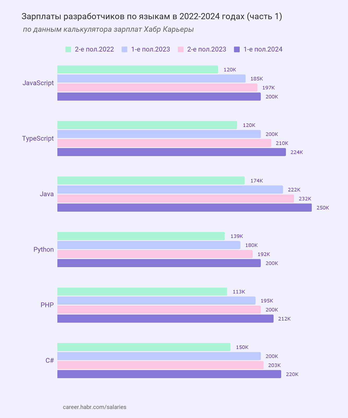 По традиции, после большого исследования зарплат в IT мы смотрим, сколько зарабатывали разработчики разных языков и квалификаций в первой половине 2024 и как их зарплаты изменились по сравнению со вторым полугодием 2023.