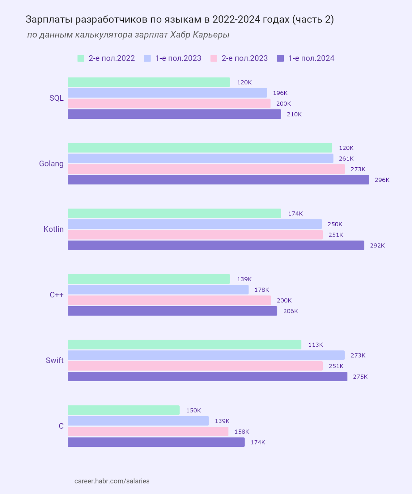 Медианная зарплата C-разработчиков в первом полугодии 2024 — 174 000 ₽ (+11,6% по сравнению со вторым полугодием 2023).