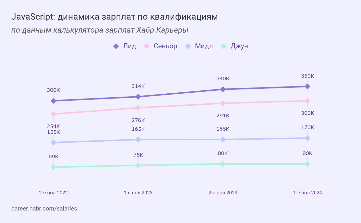 Джуны зарабатывали 80 000 ₽ (без изменений), мидлы — 170 000 ₽ (+3%), сеньоры — 300 000 ₽ (+3%), лиды — 350 000 ₽ (+2,9%).