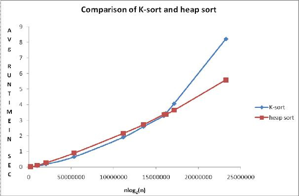 Точки на графике, построенном из таблицы 1, показывают, что среднее время выполнения для K-сортировки меньше, чем у сортировки кучей, когда размер массива меньше или равен 7 000 000 элементов, а выше этого диапазона Heapsort выполняется быстрее.