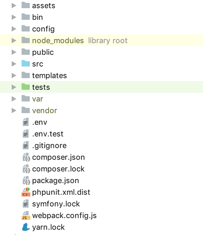 `symfony/webpack-encore-bundle symfony/form symfony/orm-pack symfony/profiler-pack symfony/security-bundle symfony/twig-bundle symfony/validator symfony/phpunit-bridge` — минимальный джентельменский набор. На данный момент структура папок у вас должна быть такая: