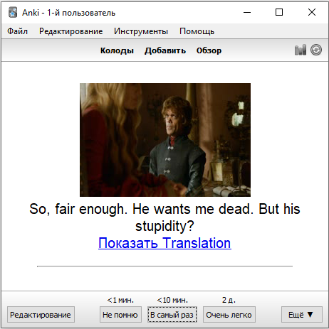 - Subs2srs создает карточки с картинками. Они удобны при первом просмотре. Но в дальнейшем картинки мешают при заучивании: я вспоминал значение многих фраз, видя картинку, а не слыша фразу.