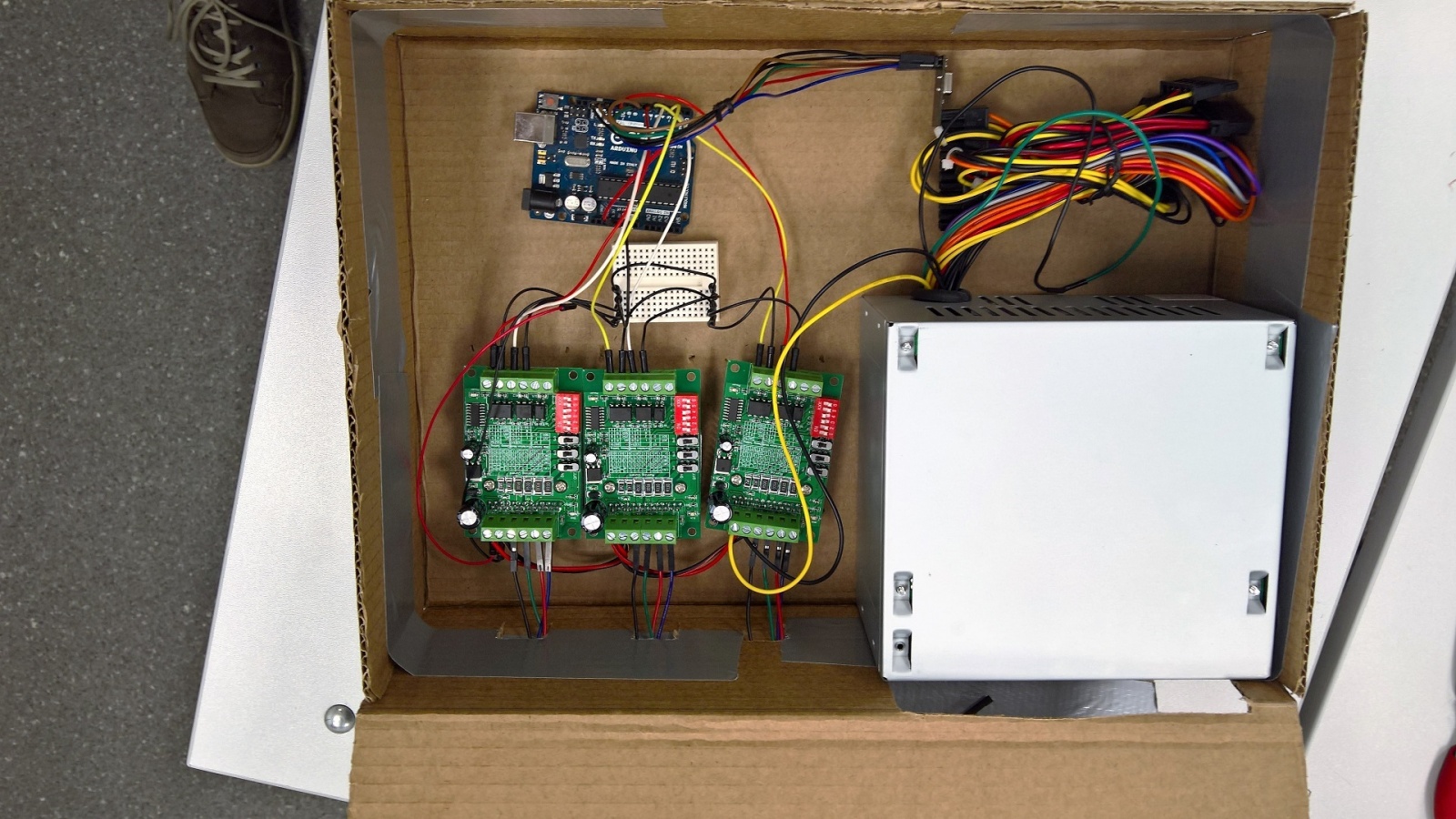 Для управления шаговыми двигателями используются драйверы TB6560, они обеспечивают ток до 3А, чего вполне хватает. Для связи с пультом управления используется радио-модуль nRF24L01+, в качестве контроллера – Arduino Uno. В качестве источника питания мы выбрали компьютерный блок питания на 450Вт, он обеспечивает необходимую мощность и при этом стоит гораздо дешевле обычных импульсных блоков. Из минусов можно отметить большой размер и активную систему охлаждения, что в нашем случаи не играет существенную роль.