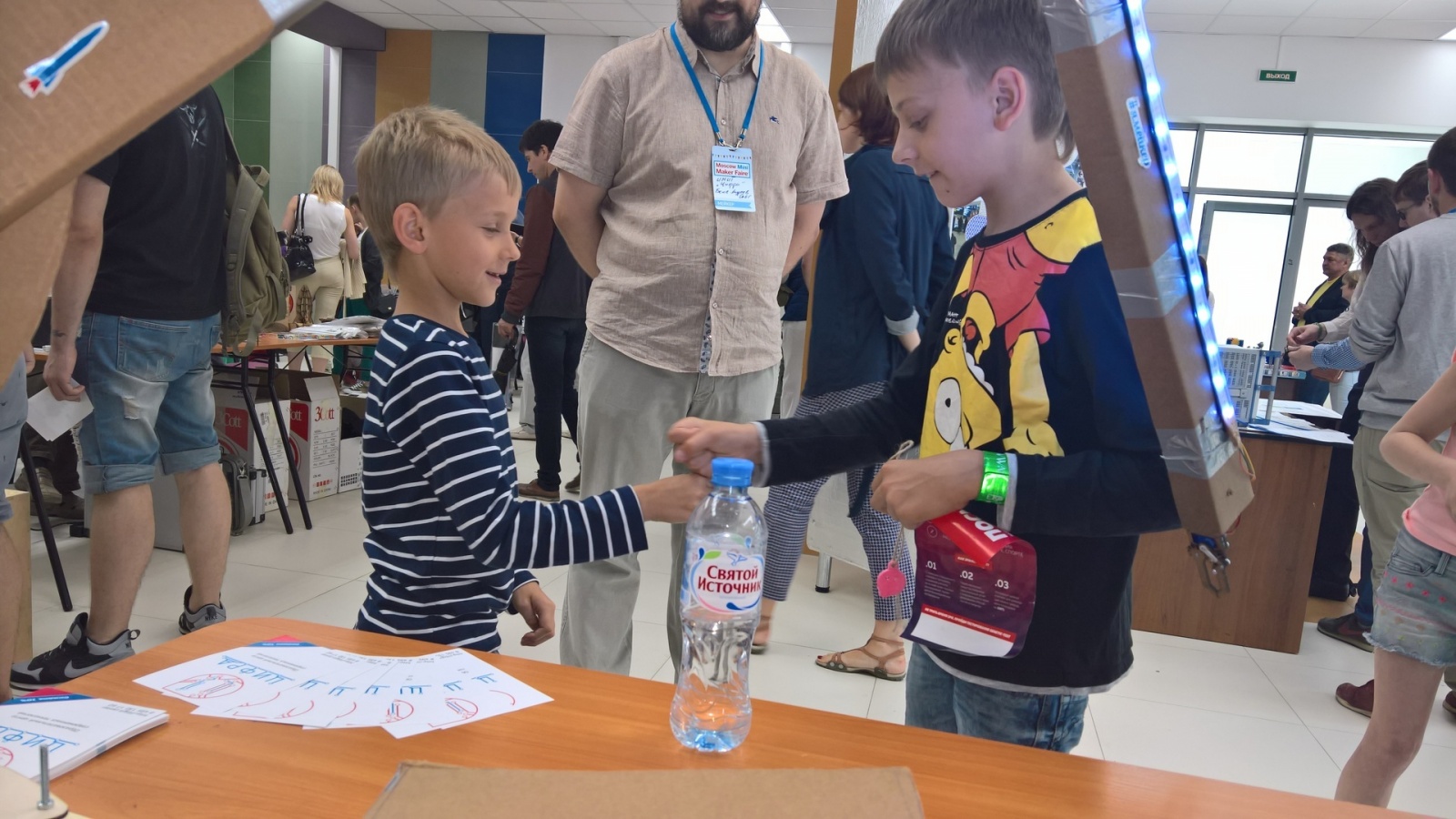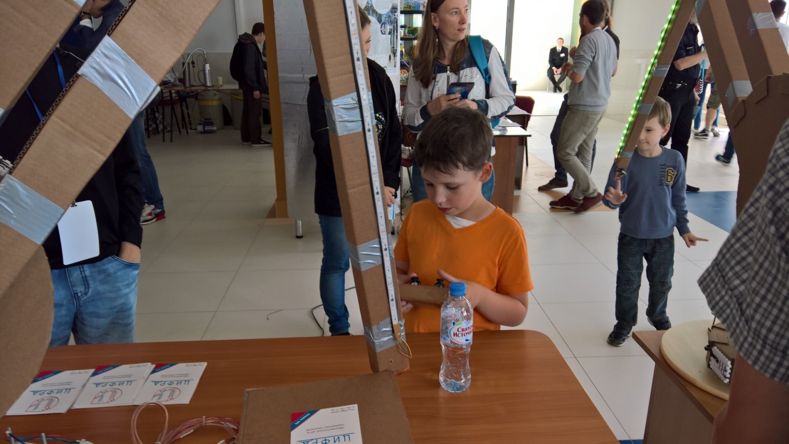 На фестивали мы были два дня, ребята демонстрировали свою работу и давали «порулить» посетителем, в основном детям. Поскольку захват у нас не работал, придумали конкурс: нужно было сбить манипулятором бутылки с водой, это было не очень просто, учитывая проскальзывания ремней, но почти все справлялись, за что получали конфетку. Судя по расходу конфет, наш стенд за два дня посетило около 400 человек, несколько раз наш проект снимали и у ребят брали интервью, в том числе мы засветились в новостях на первом канале.