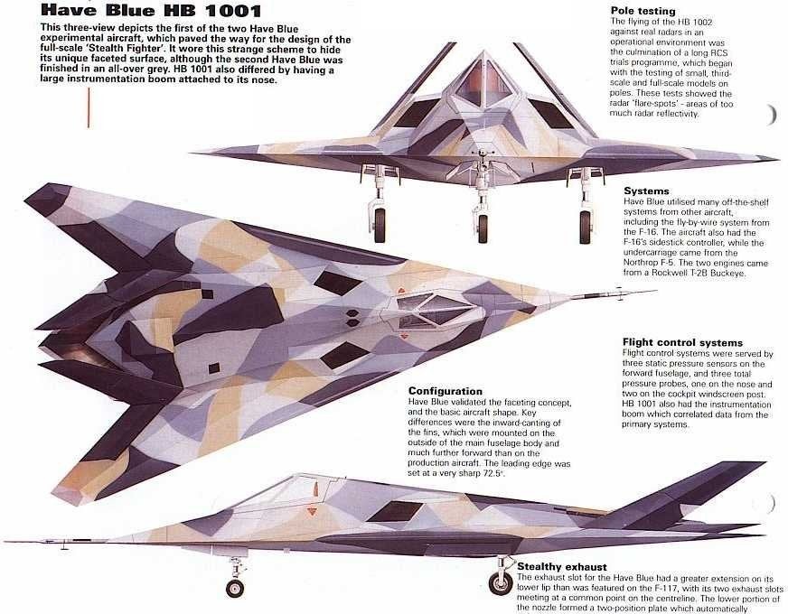 Вот тут уже началось интересное: одно дело построить макет, совсем другое дело построить то же самое, только чтобы оно и в воздух себя поднимало, и еще желательно делало это без кряхтения всего, что можно. Самолет неизбежно бы потерял в малозаметности – тут вам и двигатели, как сазди так и спереди очень неслабо светящиеся на радарах, и кабина пилота, и шасси, и механизация крыла, и другие материалы для конструкции, и тд. и тп. Однако уже через четыре месяца (макет победил в конкурсе DARPA в апреле 1976, а проект был готов к концу июля того же года) был готов проект, представлявший из себя небольшой самолет с двумя двигателями и массой даже меньше пяти тонн. Как ни странно, Have Blue оказался относительно дешевым самолетом (чего, конечно же, не скажешь об F-117), так как в нем использовались уже существующие агрегаты от уже производившихся самолетов – F-15, F-111, F-18, F-16 и даже B-52. От них, помимо прочего, Have Blue унаследовал ЭДСУ – электро-дистанционную систему управления. Она имела на борту крайне важную роль, ведь несложно догадаться, что самолет таких форм не сможет хорошо себя поддерживать в воздухе – говоря технически, самолет был неустойчив ни в одной из трех основных осей. ЭДСУ сама, без надобности в действиях пилота, стабилизировала самолет, чем обеспечивала ему, по словам пилотов, довольно неплохую устойчивость в полете.