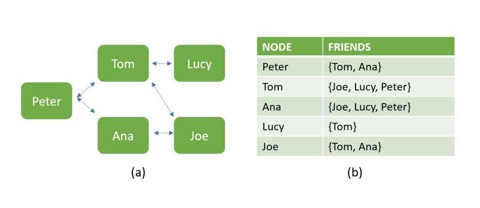 Начнём с некоторых ключевых концепций реляционных и нереляционных баз данных. Ниже показана база данных, содержащая сведения о взаимоотношениях людей. Вариант a — это бессхемная структура, построенная в виде графа, характерная для NoSQL-решений. Вариант b показывает, как те же данные можно представить в структурированном виде, типичном для SQL.
