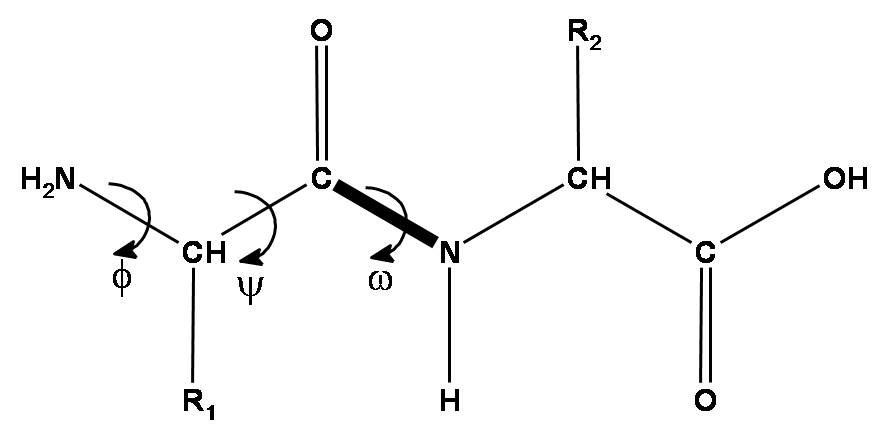 С учетом вышесказанного расположение каждого аминокислотного остатка в пространстве может быть описано 3 торсионными углами - φ, ψ и ω. Первые два угла - φ и ψ - обладают большой свободой вращения, в то время как угол ω не может сильно отличаться от 180 градусов в связи с тем, что у атома азота аминогруппы имеется электронная пара, которая любит лежать в одной плоскости с пи-электронным облаком двойной связи C=O карбоксильной группы. Поэтому пептидная связь N-C ведет себя почти как двойная и вращение вокруг нее затруднено.