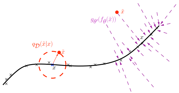 Под “шумом” здесь, кстати, может понимается довольно радикальное изменение входа. Например, если это бинарная картинка из пикселей, то можно просто убрать часть пикселей, заменив их нулями (часто убирают половину!). Но целевая функция, которую мы реконструируем, — это всё равно правильный X. Получается, что мы заставляем автокодировщик реконструировать часть входа по данной другой части: фактически, автокодировщик должен понять, как устроены все входы вообще, понять структуру того самого многообразия в чертовски многомерном пространстве.