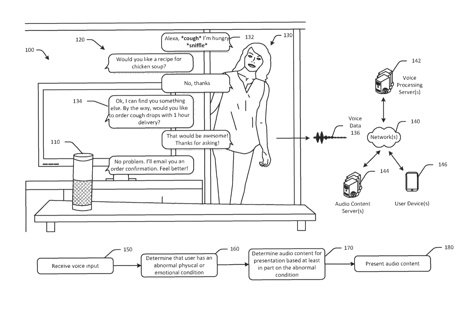 В качестве иллюстрации действия системы в патенте приводится ситуация, когда больная женщина, кашляя, говорит голосовому ассистенту, что голодна. По искаженному голосу ассистент определяет ее состояние как отклонение от нормы, выявляет причину и, помимо рецепта подходящего блюда, предлагает ей оформить заказ на доставку лекарства. Определение настроения по интонациям, безусловно, потребует более тонкого анализа, однако пример отражает общую идею, состояющую в обработке невербальных звуковых сигналов нейросетями для удовлетворения невысказанных потребностей пользователя.