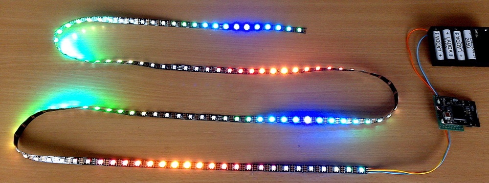 Представляю открытый проект новогодней гирлянды на основе LED ленты со светодиодами WS2812B. Гирлянда питается от 4-х AA аккумуляторов. С текущими настройками проект поддерживает 122 светодиода на ленте, но легко может быть расширен до 1000 светодиодов и более. Гибкий перенастраиваемый алгоритм генерации световых эффектов. Проект содержит программу управления гирляндой с телефонов или планшетов, компилируемую без модификаций под iOS, Android и Windows.