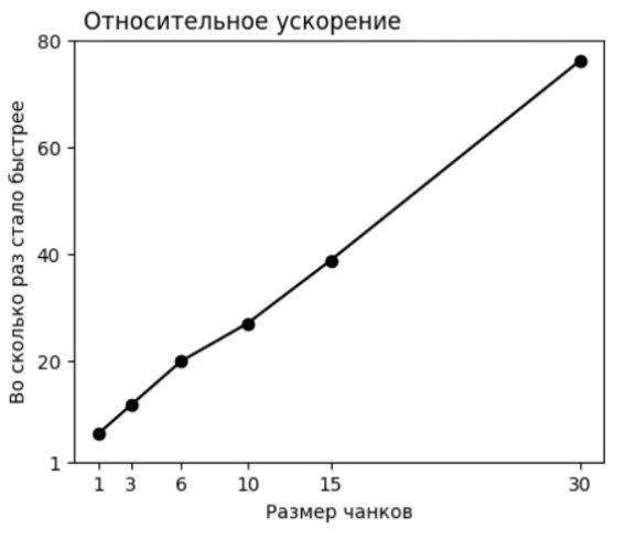 Мы сравнили время решения задачи до и после изменений. Пробовали разные размеры чанков и замеряли относительный прирост скорости. Результат показан на графике ниже.