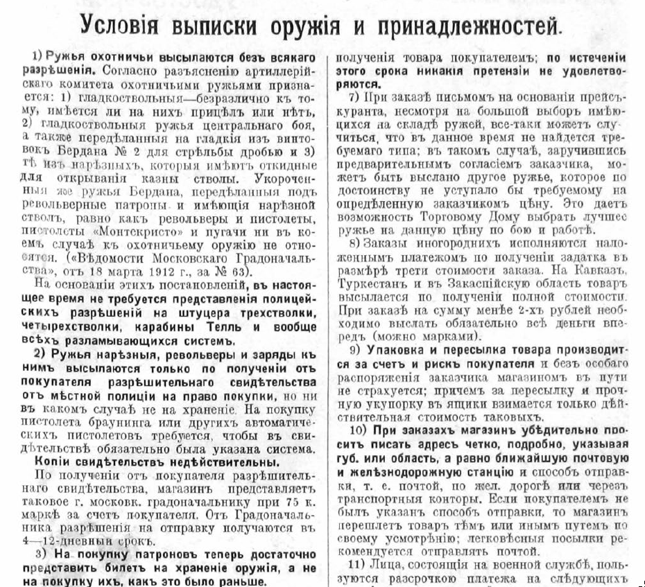 Если сравнить с современной Россией, то в царской оружие продавалось практически бесконтрольно. Гладкоствольное охотничье оружие вообще не требовало разрешения и в оружейных каталогах даже был раздел «Детские ружья».