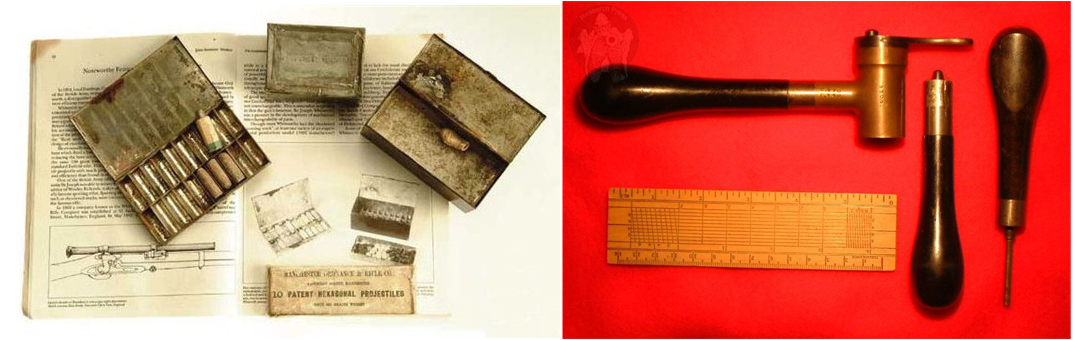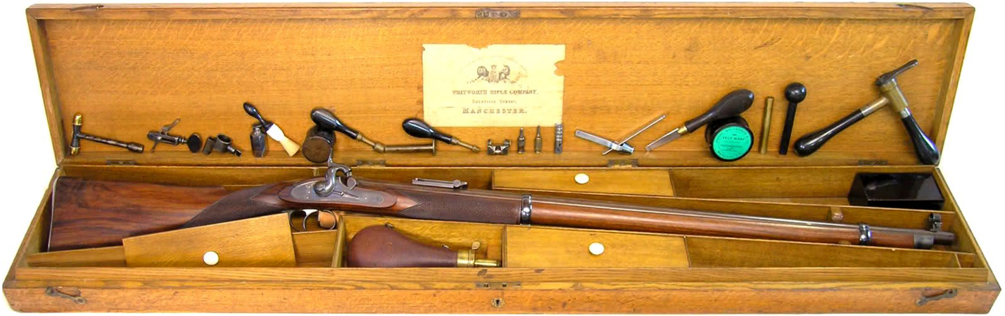 Выставочный образец винтовки Витворта, вдоль открытой крышки выставлены инструменты, использовавшиеся для обслуживания, литья пуль и заряжания.