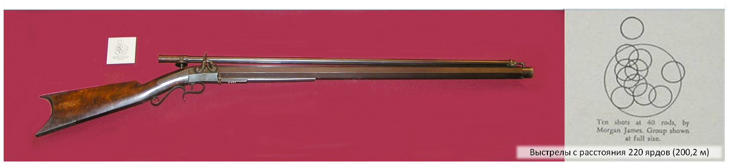 Музей Вест-Поинт. Винтовка Моргана Джеймса с прицелом Чепмена. Слева увеличенная мишень при стрельбе на 200 метров. (США)