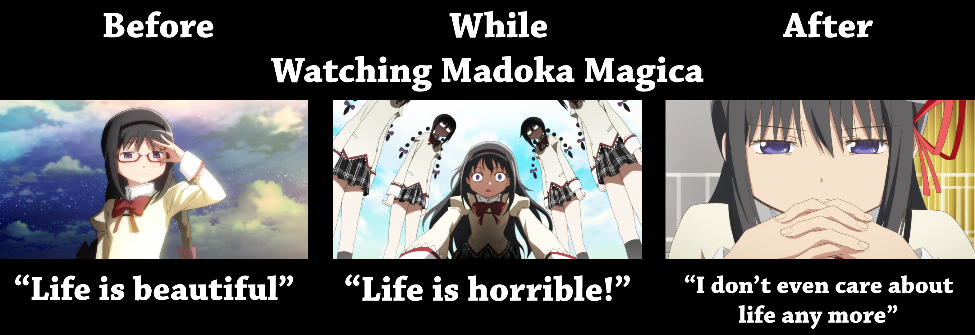 Анимешную среду изрядно перепахала «Мадока Магика». Сериал начинался как типовая, сферическая в вакууме история про девочек-волшебниц, мило и героично превозмогающих всяческих демонических злыдней. Однако с третьей серии у ожидавших этого зрителей отпадала челюсть и пребывала там же примерно до финала. «Мадока» оказалась злой, мрачной и серьёзной деконструкций жанра «махосёдзё», породила гигабайты споров о сути происходящего. А для пущего изумления аудитории, вдобавок выход серии с жуткой катастрофой совпал с ударом по Японии сильнейшего землетрясения, цунами и радиационной аварией на АЭС в Фукусиме.