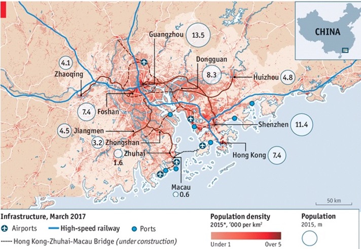 Мегарегион Дельты Жемчужной реки из 11 городов, частью которого является и Гонконг. Население всех городов кроме Гонконга и Макао с тех пор значительно выросло. Источник: The Economist, 2017