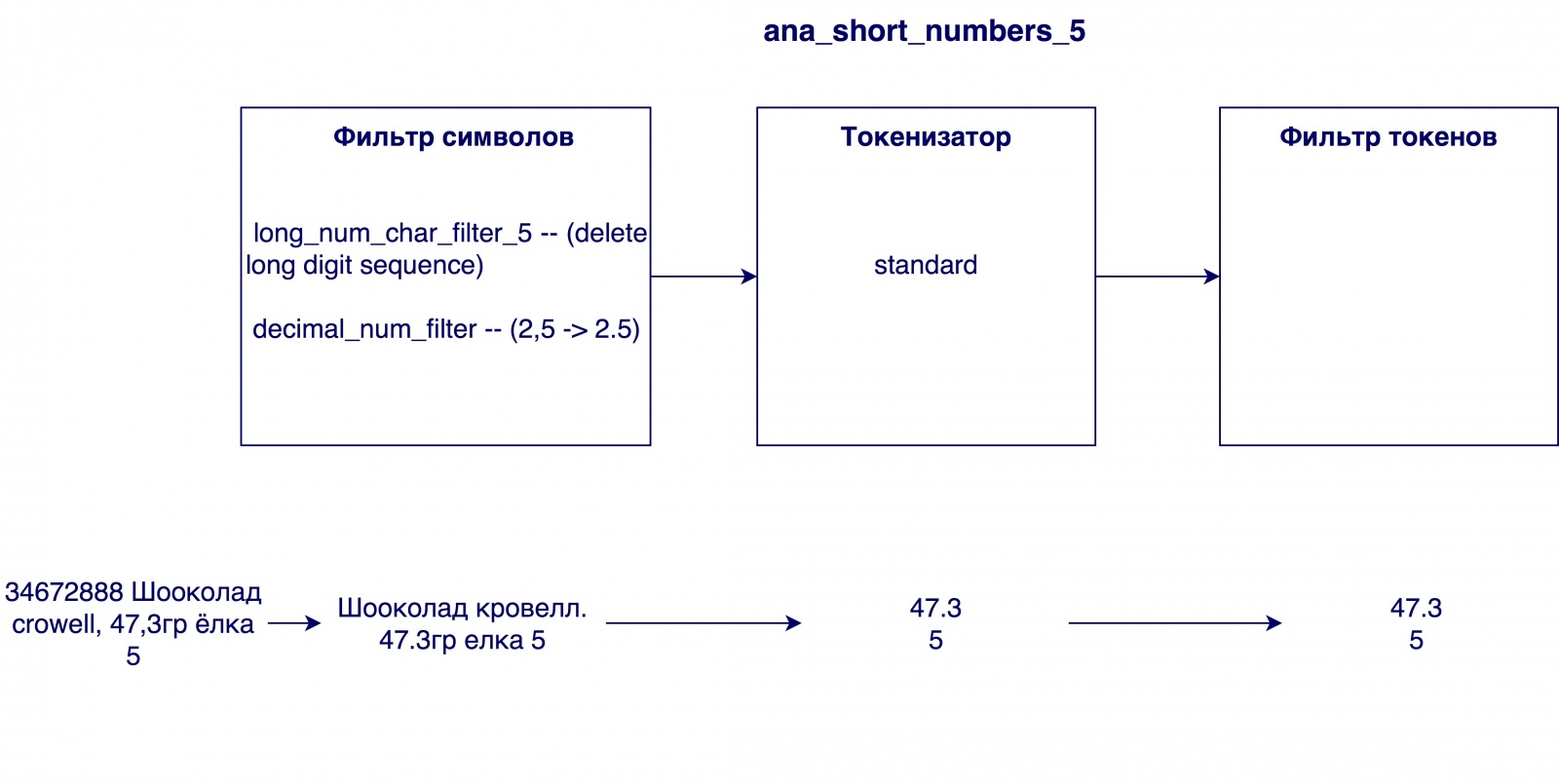 - Токенизатор для чисел — выделяет из строки только числа путем поиска регулярного выражения (н-р, "твикс экстра 2 4.5” -> “2”, “4.5”)
