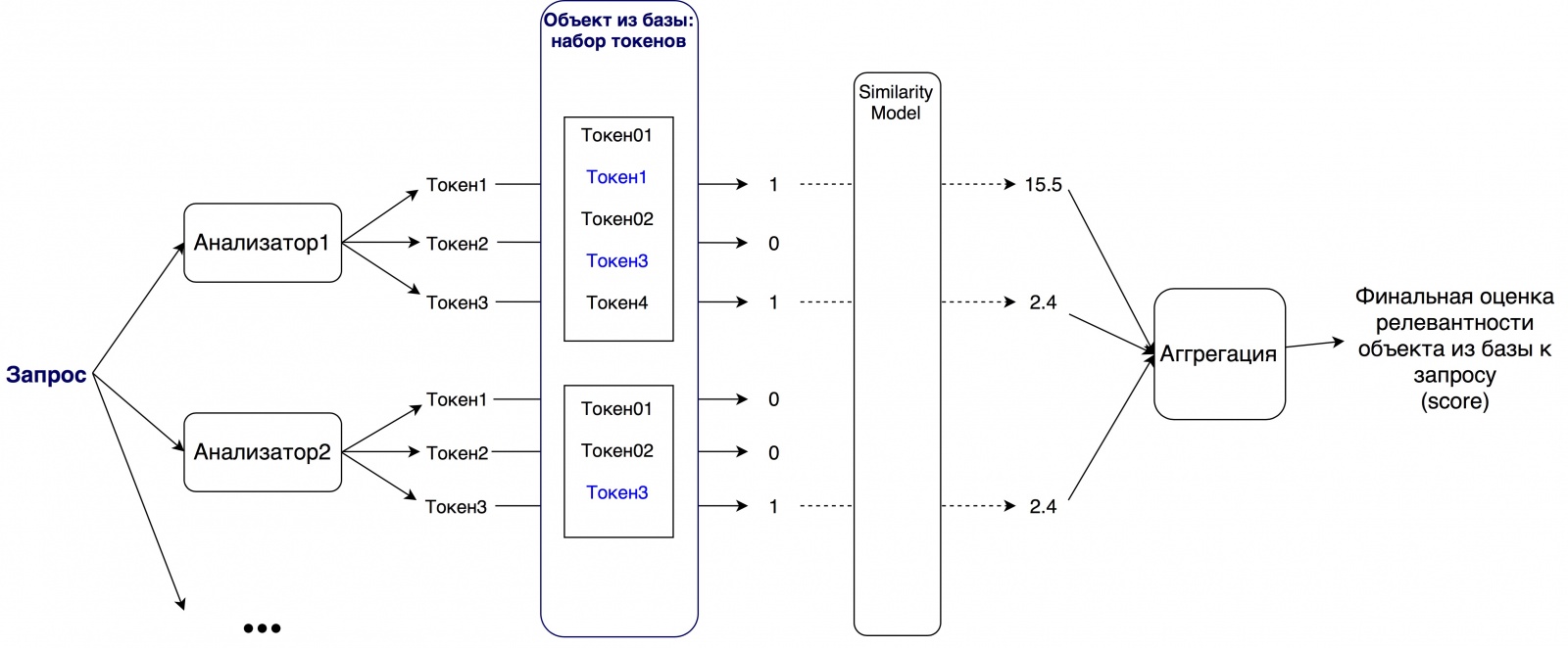 - На следующем этапе количество очков, набранных каждым отдельным токеном, определенным образом агрегируется. Параметры агрегации задаются семантикой запроса. Примером таких агрегаций могут стать дополнительные веса для определенных токенов (добавочная ценность), условия обязательного присутствия токена и тд. Результатом этого этапа является Score — финальная оценка релевантности определенного документа из базы относительно изначального запроса.