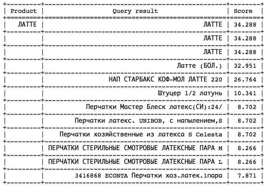 - Путем небольшой хитрости. Получаем запрос, добавляем новый товар в нашу базу с таким же названием, делаем поиск и достаем максимальный скор. Так как будет 100% совпадение по названию, полученное значение будет идеальным. Именно этот подход мы используем в нашей системе, так как опасения по поводу дороговизны данной операции в отношении времени не подтвердились.