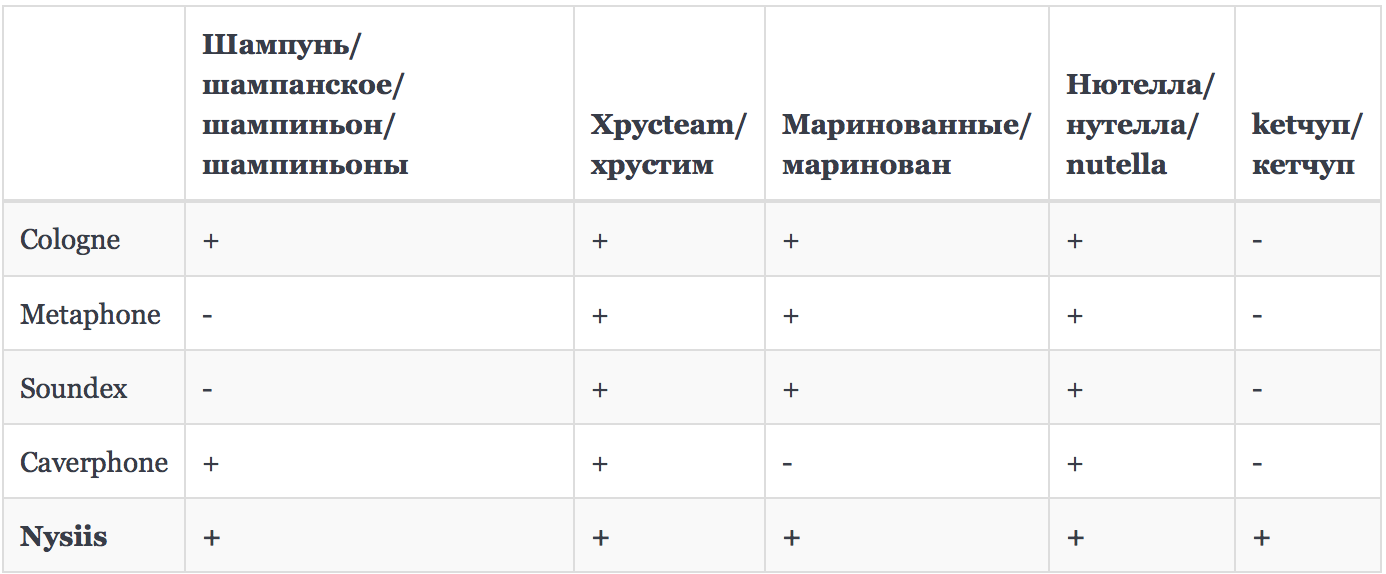 - Фонетический анализ. Необходим для того, чтобы минимизировать влияние опечаток и разных способов написания одного и того же слова на результаты поиска. В таблице представлены различные доступные алгоритмы для фонетического анализа и результат их работы в проблемных случаях. В первом случае (Шампунь/шампанское/шампиньон/шампиньоны) успех определяется генерацией разных кодировок, в остальных — одинаковых.
