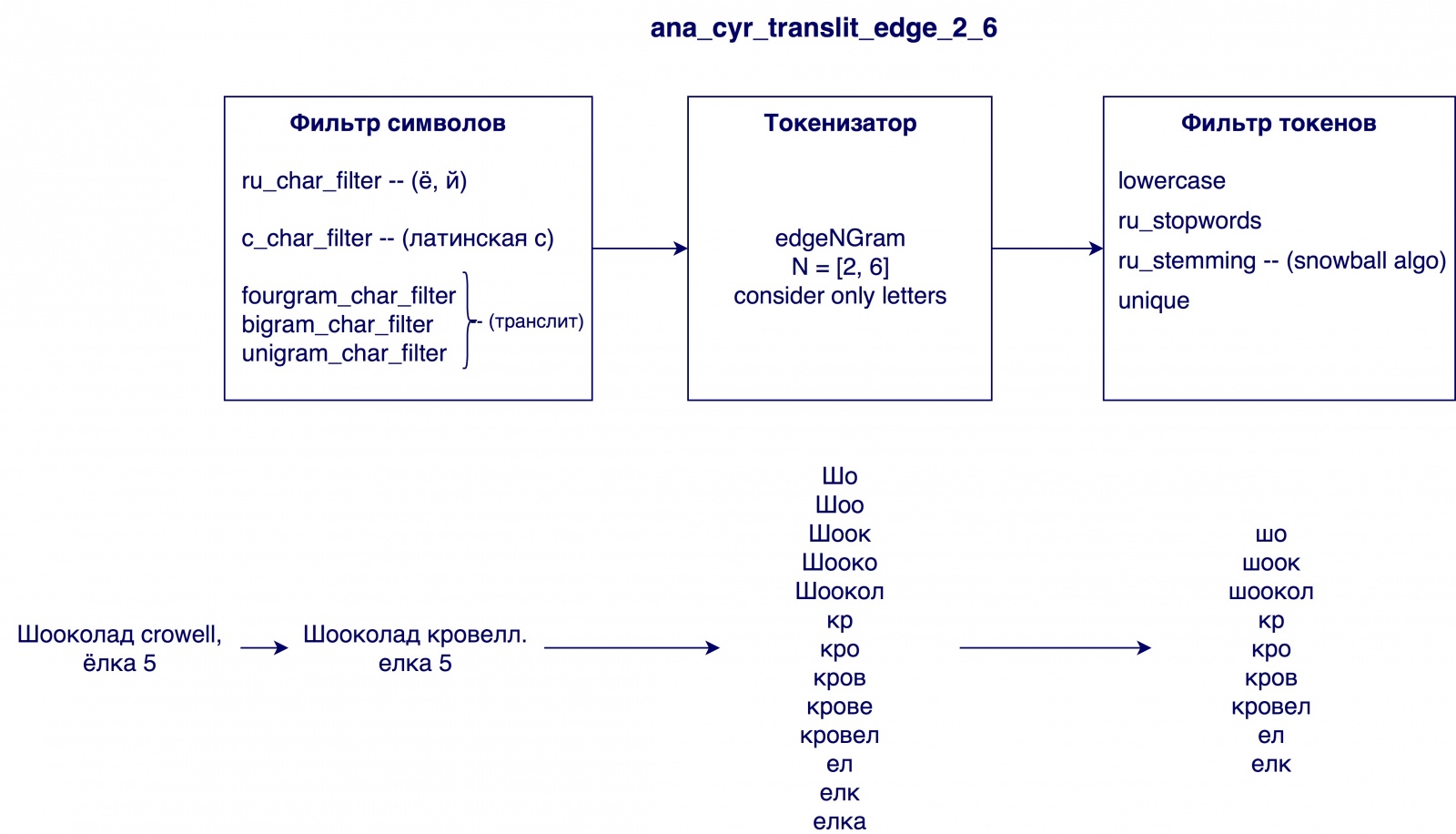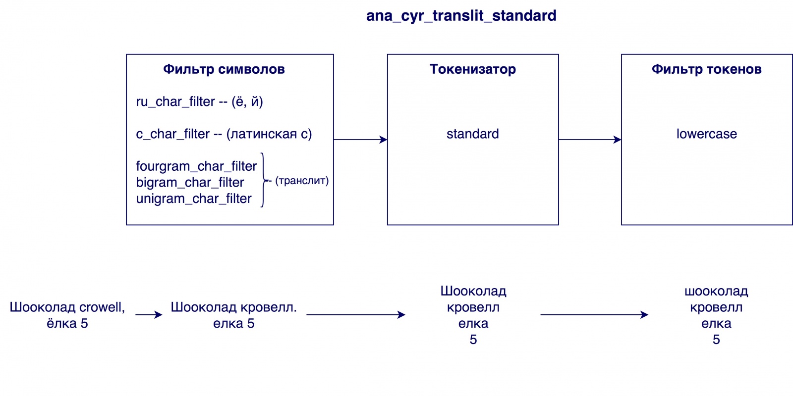Анализатор анализирует входную строку в три этапа и на выходе выдает токены — поисковые единицы: