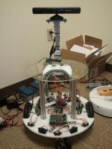 В этом году мы решили попробовать Microsoft Robotics Development Studio (MRDS), для продвижения которого Microsoft сформулировала спецификацию «MRDS Reference Platform» — набор оборудования и протокол управления «стандартным» роботом. Эта спецификация позволила бы роботолюбам создавать совместимых роботов и переносить между ними программы. По сравнению с аппаратным оснащением пылесоса, Reference Platform намного сложнее и мощнее: в спецификацию включён Kinect, три ИК-дальномера и два ультразвуковых, а также датчики вращения колёс (encoders). Реализацию MRDS RP пока что предлагает только фирма Parallax под названием Eddie (порядка £1000, не включая Kinect). Необычайное сходство Eddie с фотографиями робота-прототипа в спецификации MRDS RP наводит на мысли, что спецификация создавалась в тесном сотрудничестве с Parallax, иначе говоря — Parallax удалось добиться, что Microsoft приняли их платформу за эталонную.