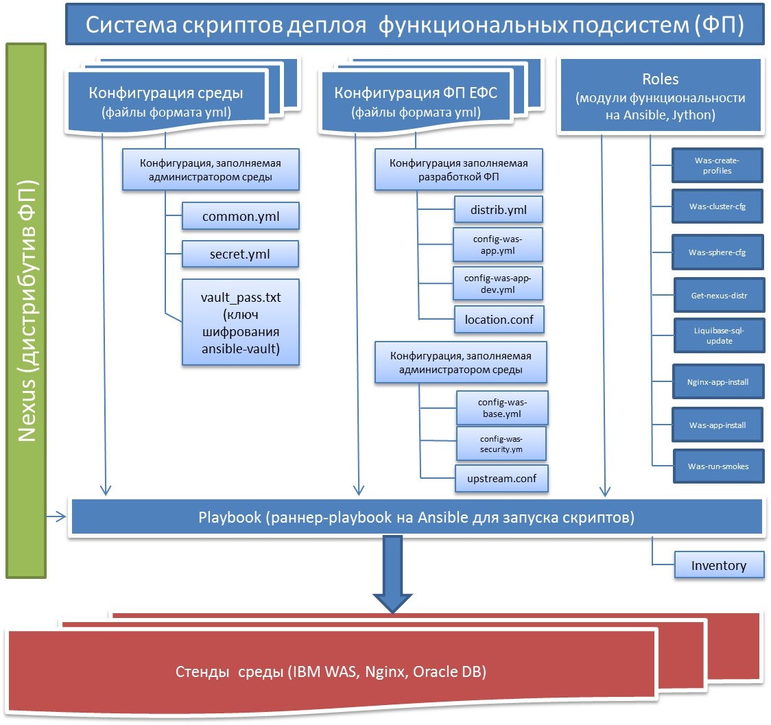 Система скриптов деплоя функциональных подсистем представляет собой пакет скриптов, включающий в себя функционал, реализованный в виде ролевой модели, и конфигурационные параметры, состоящие из двух блоков: параметры среды и параметры функциональной подсистемы.