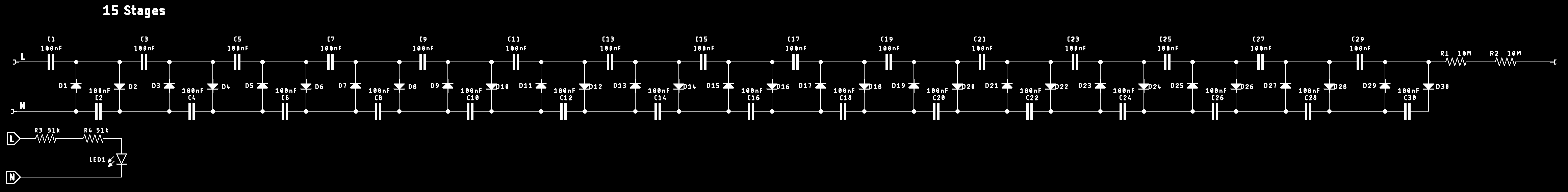 Я бы мог добавить на вход трансформатор, и сильнее увеличить выходное напряжение с меньшим количеством ступеней, но для первого прототипа я хотел сделать всё очень просто. Поэтому оставим 15 ступеней и входное напряжение 230 В.