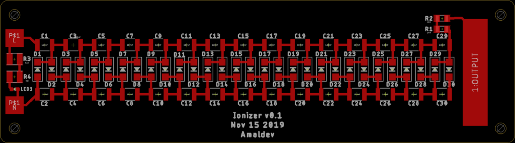 Возвращаясь к нашей системе: мы хотим выдать постоянный ток высокого напряжения (порядка 6-7 кВ). Для упрощения схемы я решил подавать на неё 230 В AC напрямую (таково напряжение в индийской электросети) [в российской 220 / прим. перев.]. Предположим, мы сделаем умножитель с 15 ступенями, тогда на выходе получим DC напряжением 230В x 2 x 15 = 6900 В (теоретически). Достаточно для ионизации.