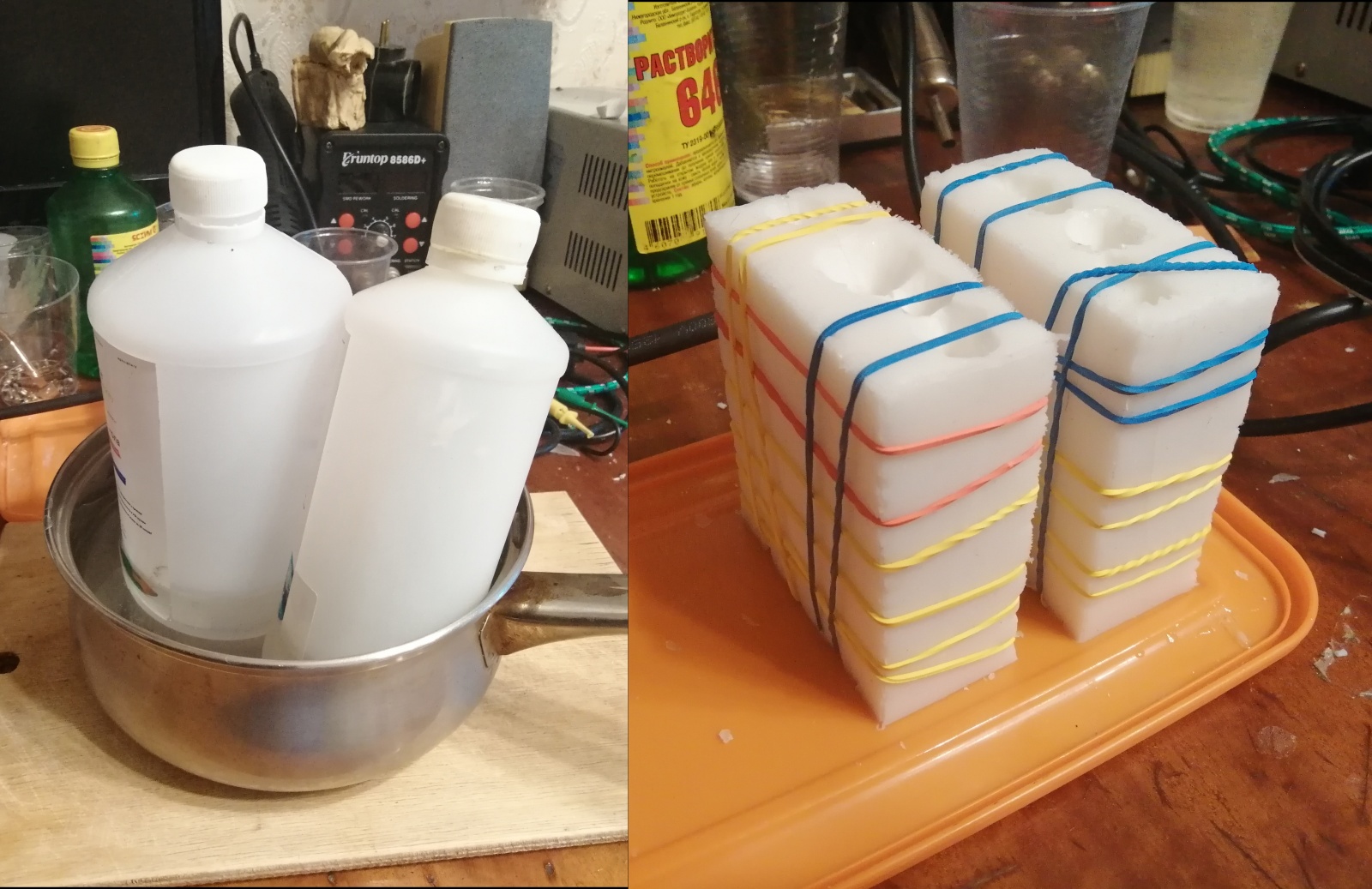 Как вытащили весь пластилин, необходимо обработать разделительным составом внутреннюю часть формы, стянуть канцелярскими резинками и залить эпоксидную смолу, предварительно прогретую на водяной бане. Прогрев очень важен, так увеличится текучесть и исчезнет осадок, если таковой присутствовал.