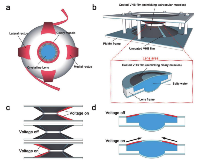 Чтобы реализовать фантастическую концепцию, учёные из Калифорнийского университета в Сан-Диего прибегли к технологии мягких роботов. Этот подход подразумевает копирование природных технологических решений для искусственного механизма. В данном случае, на контактную линзу из специального высокоэластичного полимера прикладывается напряжение и она сокращается. Аналогичным образом работает хрусталик, когда глаз млекопитающих фокусируется — цилиарная мышца изменяет его кривизну и мы видим лучше либо вблизи, либо вдали.