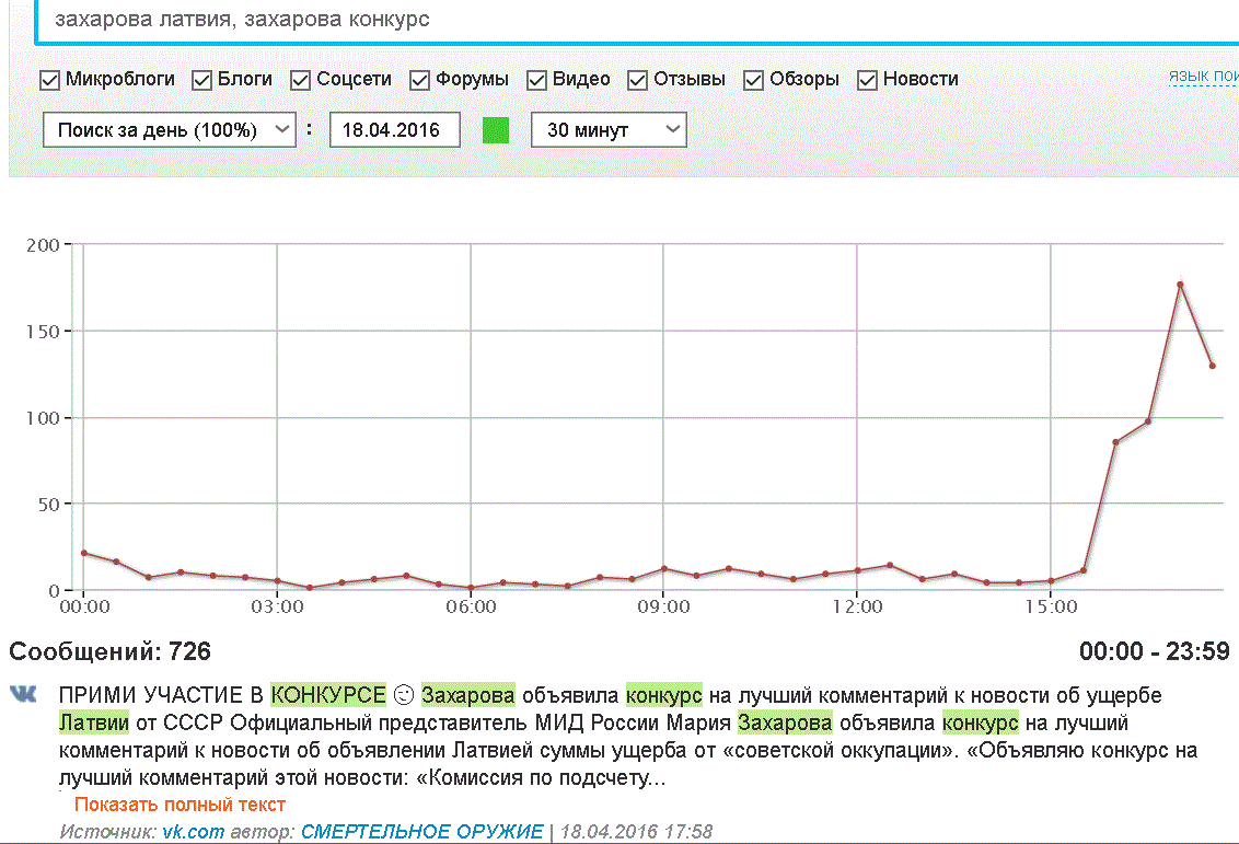 — И еще про «шпионов»: «Мне понадобилось 15 минут, для выявления ключевых игроков в социальных медиа, которые формируют в англоязычном пространстве общественное мнение и влияют на принятие решений политиками по отношению к ЛНР и ДНР (IBM Watson). Современные сервисы позволяют оперативно отслеживать активность соцмедиа и формируют модель региональной коммуникации, присваивая каждому игроку определённый социальный маркер.»
