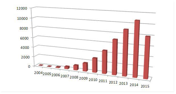 Рис. 2. Число публикаций со словом “graphene” в названии (на сентябрь 2015 года, по данным WoS)