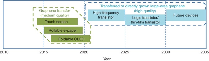 Таким удивительным материалом заинтересовались многие технологические компании, в разных странах мира начали появляться целые институты, посвященные исключительно исследованию графена, а с 2013 года в Европе реализуется масштабная программа Graphene Flagship стоимостью один миллиард евро, направленная на исследование применения графена в различных областях человеческой деятельности. Изначально казалось, что графен приведет к научно-технической революции в самых разных областях — начиная от электроники и заканчивая композиционными материалами. Ниже приведён прогноз внедрения устройств на графене из статьи К.С. Новосёлова. По его мнению, наиболее вероятное применение — основа для сенсорного экрана, электронной бумаги или органических светоизлучающих диодов. Транзисторы и другие логические устройства на его основе ожидаются лишь через 10–20 лет.