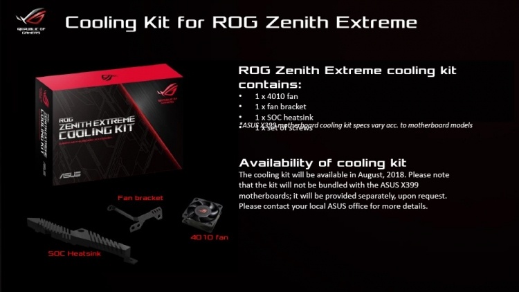 Флагманская материнская плата ASUS ROG Zenith Extreme получит набор из 40-мм вентилятора, крепления для него и дополнительного радиатора, который устанавливается на элементы питания, расположенные под процессорным разъёмом. В свою очередь комплекты для плат ROG Strix X399-E Gaming и Prime X399-A будут лишены вентилятора, но благодаря наличию в комплекте крепления для него, пользователь сможет установить собственный, в случае необходимости.