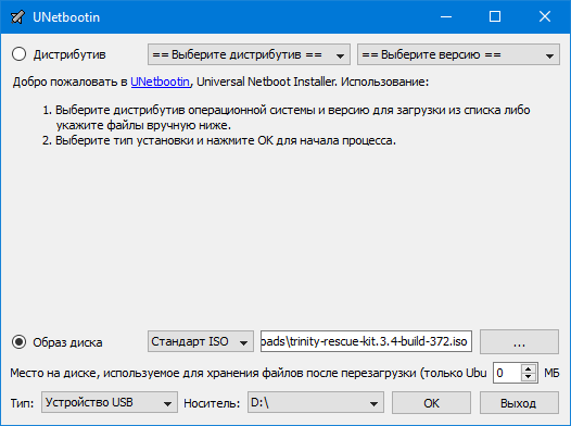 А если после Linux OS меню пустое или не прошла загрузка, то придётся ещё раз обратиться к настройкам BIOS/UEFI. Вообще AIO создаёт EFI-совместимый диск, что актуально для большинства современных машин. Поэтому есть смысл проверить, какой режим загрузки вообще выбран. Если и смена режима не помогла, то можно попробовать перенести ISO более традиционным способом — с помощью Unetbootin. Эта утилита не даёт никакого выбора никаких настроек: просто выбираете образ диска, указываете букву очищенной USB-флешки и жмёте OK. После завершения записи имя диска надо поменять на TRK_3-4 (именно такое).
