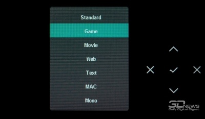 В мониторе предустановлено 8 режимов изображения, в том числе чёрно-белый Mono. Система управления представлена на базе пятипозиционного джойстика, а эргономика крупного «безрамочного» экрана на тонкой ножке ограничена достаточно узким диапазоном регулировки степени наклона.
