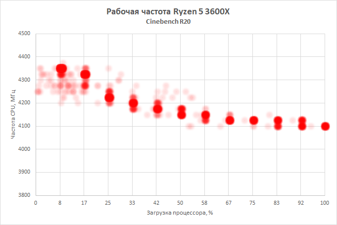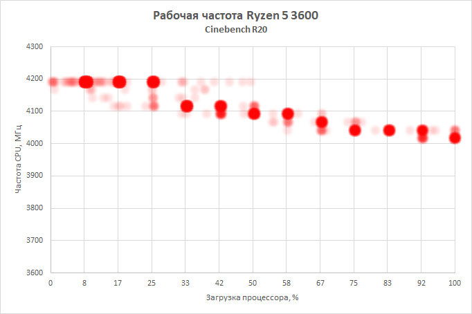 Вот, например, как распределяются реальные рабочие частоты Ryzen 5 3600X в Cinebench R20 при нагрузке на различное число вычислительных ядер.