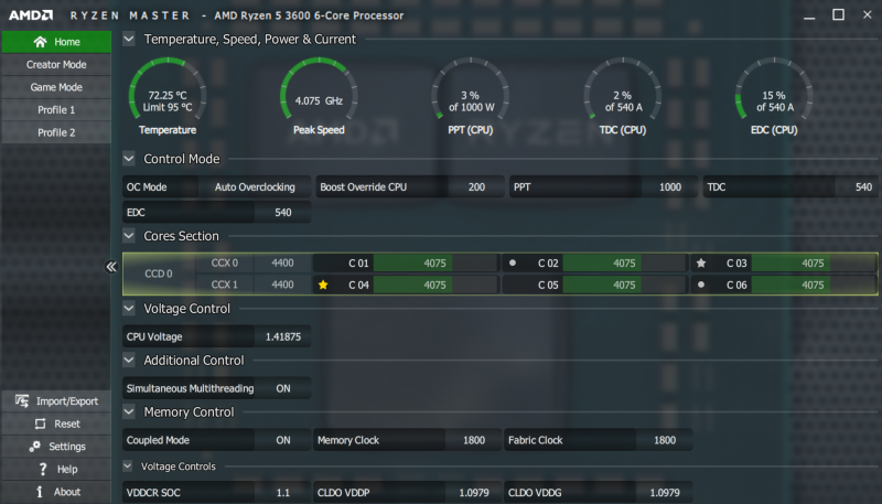 В результате при ручном разгоне до какой-то единой фиксированной отметки мы почти наверняка проиграем в производительности в малопоточных режимах, поскольку Precision Boost 2 в них, скорее всего, сможет разогнать процессор сильнее. Впрочем, попробовать мы всё равно были обязаны, хотя бы для того, чтобы убедиться: Ryzen 5 3600 и Ryzen 5 3600X, как и их старшие собратья, уже разогнаны до нас.