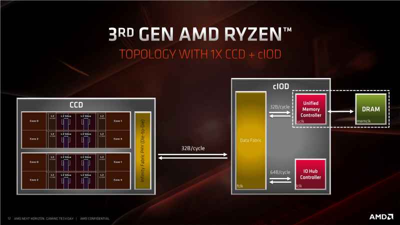 Стандартный в шестиядерниках и cIOD-чиплет. Этот кристалл содержит в себе контроллер памяти, логику Infinity Fabric, контроллер шины PCI Express и элементы SoC и производится на мощностях GlobalFoundries по 12-нм техпроцессу. Полная унификация составных частей шестиядерников со старшими моделями Ryzen 3000 означает, что они наследуют все преимущества старших собратьев: беспроблемную поддержку скоростной DDR4-памяти, возможность асинхронного тактования шины Infinity Fabric и поддержку шины PCI Express 4.0 с удвоенной пропускной способностью.