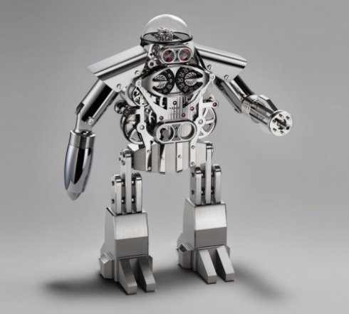 Часы-робот Melchior насчитывают более 470-ти деталей, практически все из которых изготавливались вручную. Запаса хода аппарата хватит на 40 дней, а про оставшийся запас можно узнать при помощи специального циферблата, который расположен на «животе» робота.