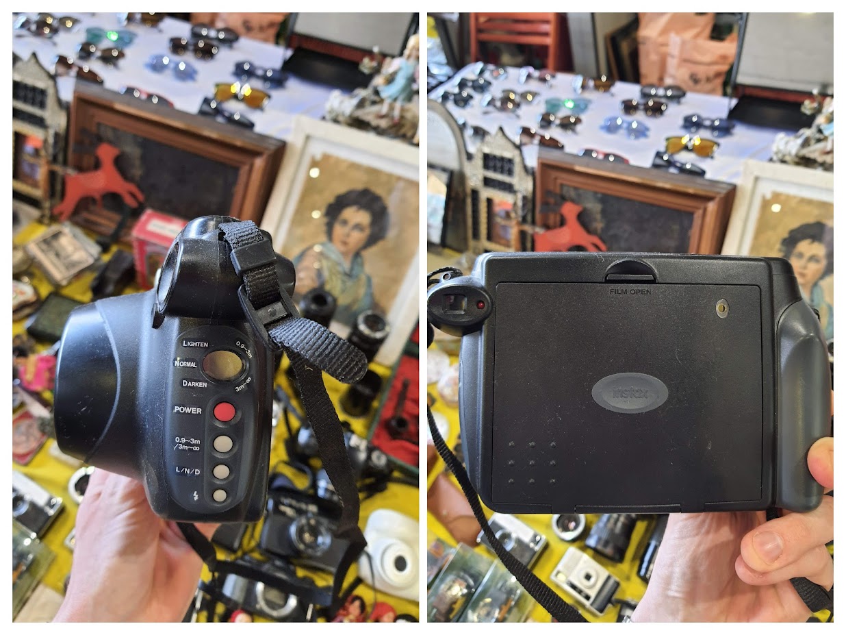 Фотоаппаратов любых годов и исполнений тут больше всего. Совсем древние, плёночные, на картриджах, цифровые. Аккумуляторов внутри или нет, или они дохлые, так что работоспособность не проверить. Также много объективов.