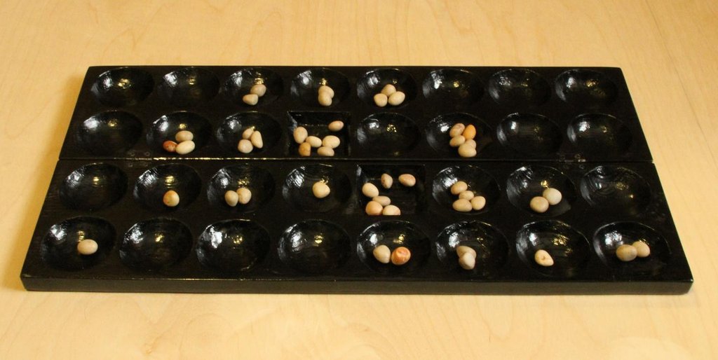 "Бао суахили" является хорошим примером игры со сложным жизненным циклом. В этой игре две фазы, правила выполнения хода в которых существенно различаются. В начале игры, часть камней находится «в руке» каждого из игроков. Пока камни «в руке» не кончились, происходит вброс камней в лунки, по одному камню. Когда камни «в руке» заканчиваются, начинается вторая фаза игры, связанная с перераспределением вброшенных камней. Нельзя сказать, что эту игру невозможно описать на ZRF (языке описания ZoG), но из за ограничений ZoG, подобная реализация получилась бы крайне запутанной (что безусловно не лучшим образом отразилось бы на качестве работы AI). Посмотрим, как описание подобной игры могло бы выглядеть в «идеальном мире»: